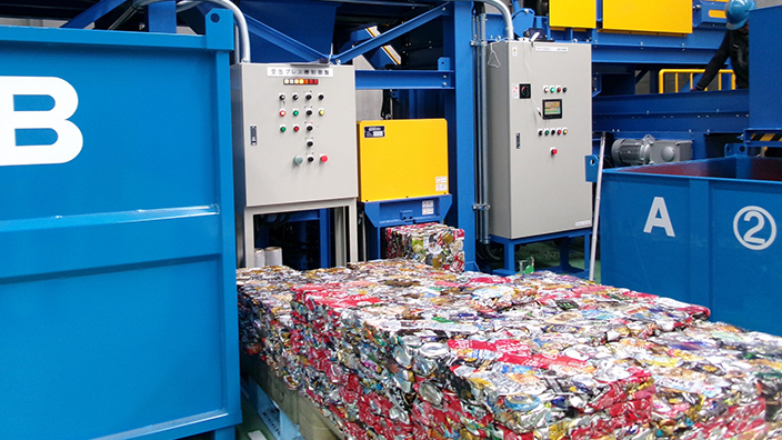 選別されたスチール缶とアルミ缶類は圧縮されて出てきます。